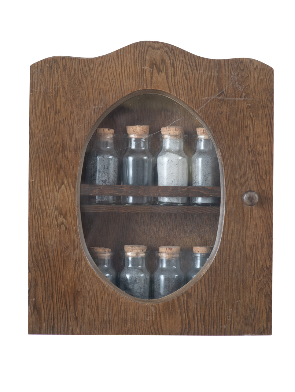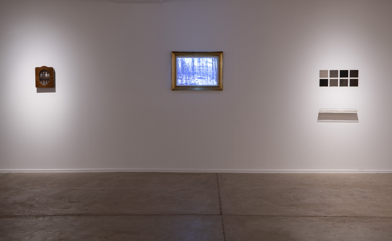 Instalación realizada con un armario de botica que dispone un conjunto de recipientes con ceniza de texturas y tonalidades diferentes, acompañados de un Pantone con su color a modo de pigmento. Corresponden a las cenizas de los incendios acaecidos en las islas Canarias cuyos lugares de recogida se muestran en el vídeo: IF Tejeda 2019, IF Tasarte 2020, IF El Paso 2021, IF Fataga 2023 y IF Tejeda 2023. También del Volcán Tajogaite 2021.